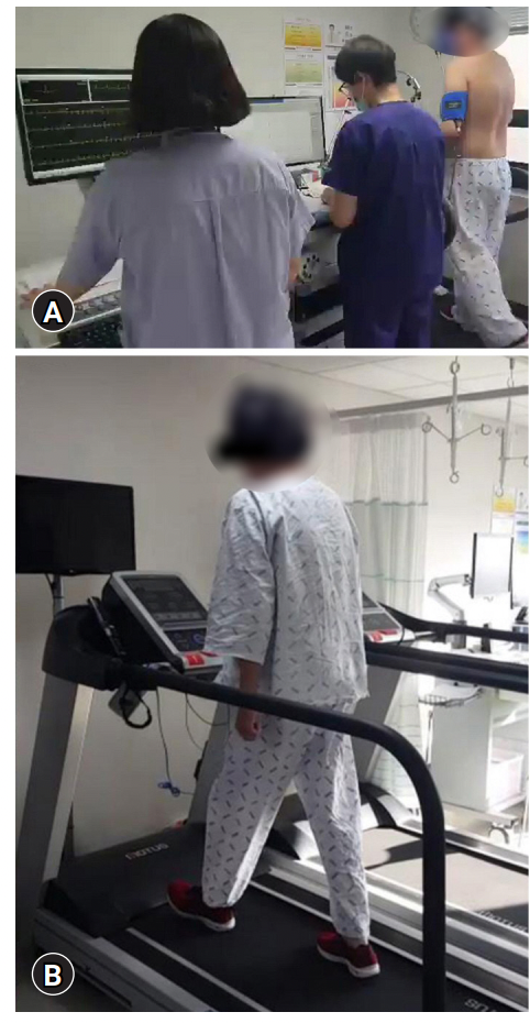 入院后第38天,取下鼻胃管,在透视吞咽研究后开始口服喂养。在第43天确认患者有足够的咳嗽和咳痰能力后,拔除气管造口管。患者接受了物理治疗。入院后第45天进行了首次症状受限运动耐力测试(ETT)(图3A)。14分48秒后,由于患者腿部不适,ETT终止。使用Fitness Registry和运动重要性数据库(FRIEND)公式,反映年龄和体重的预测VO 2 max为42.15 mL/kg/min。测得的VO2 max为21.7 mL/kg/min(占预测值的51.5%),并且运动心电图和血流动力学反应无异常。该患者参加了2周的CR计划(每周1次,每次5次)(图3B)。开始使用4.6代谢当量(MET)进行心电图监测的运动训练,并且强度逐渐增加。