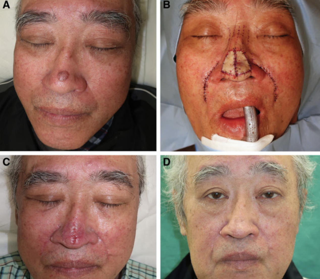 一名67岁的男子接受了10×12 mm皮肤肿瘤的活检,该肿瘤在鼻尖持续了3-4年。组织病理学显示基底细胞癌(图1A)。从肿瘤边缘划一条5 mm的安全缘,并尽可能与美学单位对齐。然后从软骨膜切除肿瘤,导致26×32 mm的缺损。从双侧鼻唇沟收集全厚度的皮肤移植物以修复缺损(图1B)。