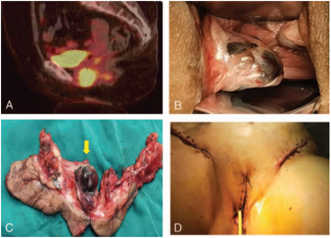 正电子发射断层扫描显示 右阴道壁中下部3.1×2.6×3.2cm肿块(图1A)。妇科检查发现 阴道口右下段有2-3cm外生黑色肿块,距尿道口2厘米。阴道前下壁粘膜变黑、增厚,小阴唇内侧有散在的黑点(图1B)。根据国际妇产科联合会(FIGO)系统,患者诊断为III期疾病。对病灶进行手术,局部切除肿瘤和腹股沟淋巴结清扫(图1C)。
