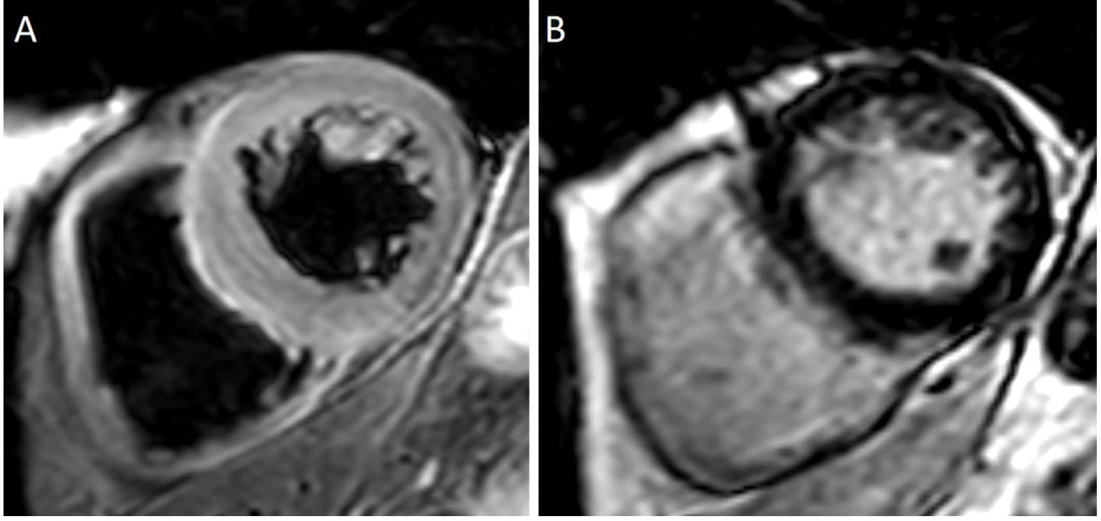 图5: 心脏磁共振成像。可见T2信号强度整体升高(A),但晚期钆增强(LGE)影像学表现正常(B),提示心肌水肿
