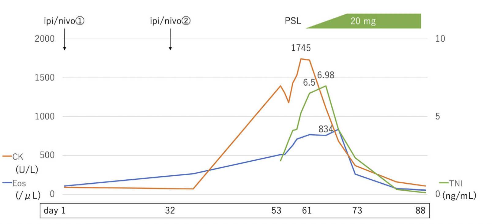 药物诱导淋巴细胞刺激试验(DLST)对两种ICI治疗均为阳性。第三次ICI治疗终止,然而,入院1周后,TNI水平上升到6.5 ng/mL,虽然怀疑MG是由于后颈疼痛和头部下降,但患者没有肌肉无力的证据,自身抗体阴性。大剂量泼尼松龙(PSL)与MG加重的风险相关;因此,PSL治疗开始于5mg /天。CK水平在第64天达到峰值,TNI水平在第67天达到峰值,每3天增加5 mg剂量。第73天,PSL剂量增加到20 mg/d。经证实TNI水平无进一步升高,PSL无副作用后,患者出院。