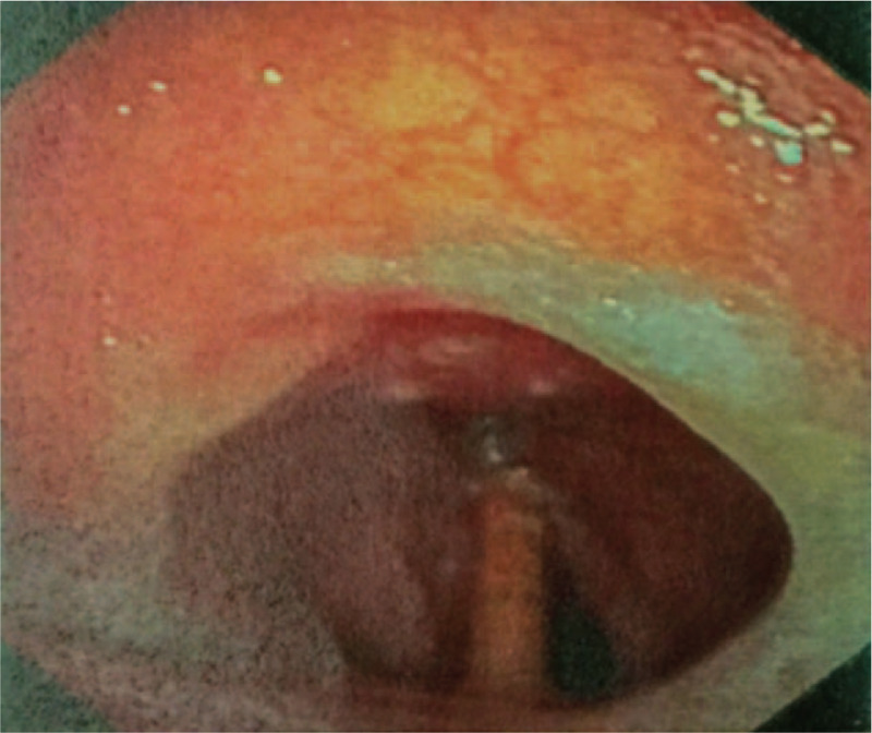经体格检查,患者生命体征稳定,无喘鸣音和呼吸窘迫迹象,但有心脏杂音和双侧喘息。平片除双侧下肺野有轻度斑片状阴影外,未见异常。病人在家人的支持下接受了喉镜检查。喉镜检查显示一个木棒在声门入口上的前后位置,末端指向前方(图1)。