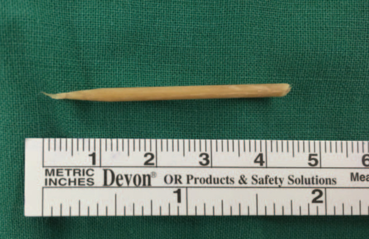 在麻醉前,病人接受了静脉注射地塞米松5mg。右美托咪定与瑞芬太尼合用进行麻醉,20分钟后,病人睡着,但可以被唤醒,可以遵简单的指示,并且可以自主呼吸。右美托咪定 2μg/kg/min和瑞芬太尼1 μg/kg/min维持。麻醉师将喉气管表面麻醉药盒引入患者口腔,并在口咽和舌根表面局部喷洒1%利多卡因。静脉注射瑞芬太尼20 μg后,直接行喉镜检查,用活检钳成功取出异物。异物为一根折断的木棒,长45 mm直径2.5mm(图2)。