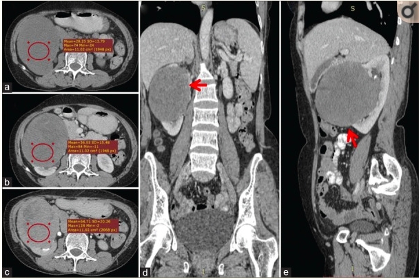 腹部超声显示右肾上极和中极有一个大的异质性高回声占位性病变。对腹部进行了对比增强计算机断层扫描,发现右肾上极和中极有一个大小为12cm×10cm的不均匀强化肿块,累及肾窦。肾静脉未见癌栓(图1)。附近的组织没有被累及。进行转移性检查(肝功能、血清碱性磷酸酶和胸部X光检查),结果均在正常范围内。建议患者接受开放性右侧根治肾切除术。术中,肿块紧贴肝脏,从中仔细解剖。肾动脉被双重结扎并分开,然后以相同的方式处理肾静脉。将根治性肾切除标本送去组织病理学检查。术后过程平稳,术后4天患者出院。