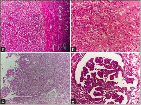 图2. a 具有完整包膜的肾脏肿瘤(HE,x10);b 肿瘤细胞呈小管和索状排列,并向梭形细胞转变(HE,x20);c充满肾盂的肿瘤细胞(HE,x20);d 乳头状腺瘤(HE,x20)。