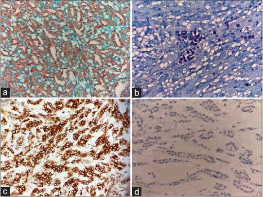 图3. a 阿尔辛蓝突出粘液基质(×40);b 甲苯胺染色突出肥大细胞 (×40);c 肿瘤细胞CK7阳性(IHC×40);d 肿瘤细胞P63呈阴性 (IHC × 40)。