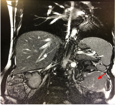 B超显示肝内多发低回声结节。最大的在左肝,大约3.4cm× 2.5cm,右肝约5.7cm× 5.2cm。两处边界清晰规则,内部可见血流迹象。MRI检查提示肝脏内有多个肿块,有转移的可能。在左下腹发现一个肿块,很有可能是恶性(图1)。