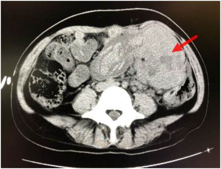 36岁患者,怀孕38周零5天,孕期顺利。于2017年10月26日出现不明原因左上腹疼痛入院,持续4天。患者无恶心,呕吐及发烧,有便秘。血白细胞水平为12.99×109/L,C反应蛋白20mg/L,生化和凝血功能基本正常。肿瘤标志物增加,包括癌胚抗原(CEA)89.58 ng/mL(0–5 ng/mL)、癌抗原15-3(CA 15-3)148.60 U/mL(0–31 U/mL)、CA 125 104.50 U/mL(0–35 U/mL)、CA 19-9 1957.00 U/mL(0–35 U/mL)、CYFRA 21-1 12.6 ng/mL(0–3.3 ng/mL)、神经元特异性烯醇化酶(NSE)45.6 ng/mL(0–18 ng/mL),鳞状细胞癌(SCC)抗原4.04ng/mL(0-1.5ng/mL),甲胎蛋白(AFP)正常。