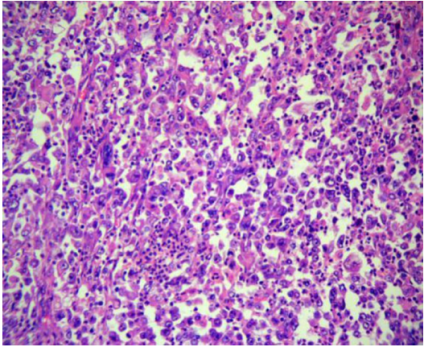 在积极改善后,于2017年11月9日进行了术前准备,随后进行了剖腹手术。在手术过程中,观察到腹部骨盆内有轻微血性腹水,约500ml,肝脏内有多个可触及的硬转移结节。在乙状结肠系膜一侧,发现一个直径约12cm的巨大肿瘤,肿瘤与肠壁相连,乙状结肠系膜几乎被肿瘤占据。肠系膜很难辨认,没有浸润到腹盆壁或附件的迹象。患者接受根治性乙状结肠切除术和结肠单腔瘘手术。术后病理证实乙状结肠恶性肿瘤,低分化(图3)。癌细胞穿透了浆液层。静脉内可见肿瘤血栓形成。手术部位两端均未发现癌残留。共有9/10肠系膜淋巴结转移。