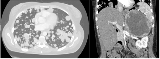 图1. CT扫描(2020年1月)检测到多个肺转移病变和肾上腺肿块