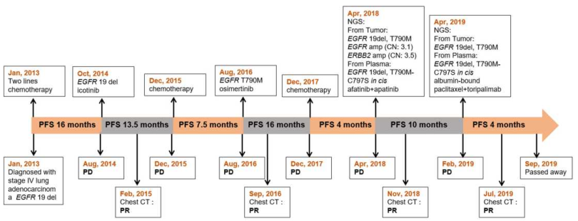 在这里,本病案报告一位难治性晚期非小细胞肺癌患者,出现EGFR 19Del-T790M-cis-C797S和HER2扩增,并接受了大量的预处理,经过阿法替尼和阿帕替尼的联合治疗后取得了超过10个月的无进展生存期。