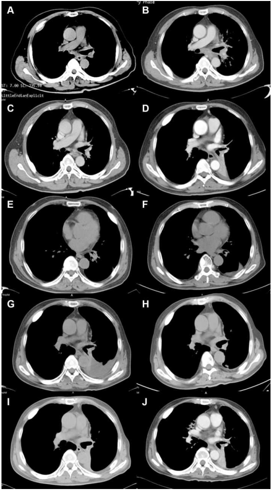 图2.(A)2013年1月诊断时的基线CT扫描。(B)2014年8月化疗后的PD。(C)2015年2月伊可替尼治疗后的PR。(D)2015年12月伊可替尼治疗后的PD。(E)2016年9月奥西莫替尼治疗后的PR。(F)2017年12月奥西莫替尼治疗后的PD。(G)2018年4月化疗后的PD。(H)2018年11月,阿法他尼和阿帕替尼联合治疗后的PR。(I)2019年2月,阿法他尼和阿帕替尼联合治疗后的PD。(J)2019年7月,白蛋白结合紫杉醇和托瑞帕利单抗治疗后的PR
