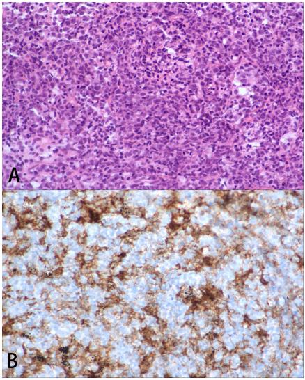 2020年8月20日,患者因全身和中枢神经系统病变,接受了4个周期的R2-CHOP(利妥昔单抗、来那度胺、环磷酰胺、表柔比星、长春新碱、泼尼松)和R2-大剂量MTX(利妥昔单抗、来那度胺、和甲氨蝶呤)替代方案作为一线治疗。在每个周期中,患者还接受了甲氨蝶呤(10mg)、地塞米松(5mg)和阿糖胞苷(50mg)的鞘内注射。然而,在四个周期的治疗后,中期PET/CT扫描(图1B)显示肺和纵隔病变和FDG摄取增加(SUVmax=31.5),其他病变的大小显著减小。腰椎穿刺复检显示脑脊液压力(180mmH2O)和蛋白质浓度(0.66g/L)降低。根据中期检查,肺部和纵隔病变显示疾病进展,尽管中枢神经系统和其他外周受累处于缓解期。肺活检证实存在淋巴瘤。2020年12月20日,治疗转为一个周期的Gemox方案(吉西他滨和奥沙利铂)作为二线治疗,仍提示疾病进展。对于原发性难治性tDLBCL,没有首选方案。重复病理分析活检显示淋巴瘤仍为DLBCL,PD-L1表达。图2)。该患者还具有CREBBP突变。既往研究表明,PD-L1表达与PD-1抗体敏感性相关,乙酰转移酶CREBBP的突变表明HDACi可能有效。因此,患者接受信迪利单抗加西达本胺作为补救治疗。信迪利单抗的剂量为每周期静脉注射200mg,西达本胺的剂量为每周2次口服30mg,每21天重复一个疗程。四个周期的联合治疗后,PET/CT扫描(图1C)表明,根据2014年卢加诺标准,该患者被认为处于完全代谢缓解状态。腰椎穿刺证实了淋巴瘤的持续清除。