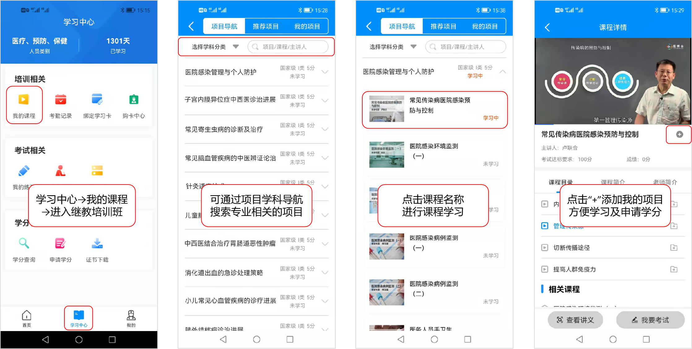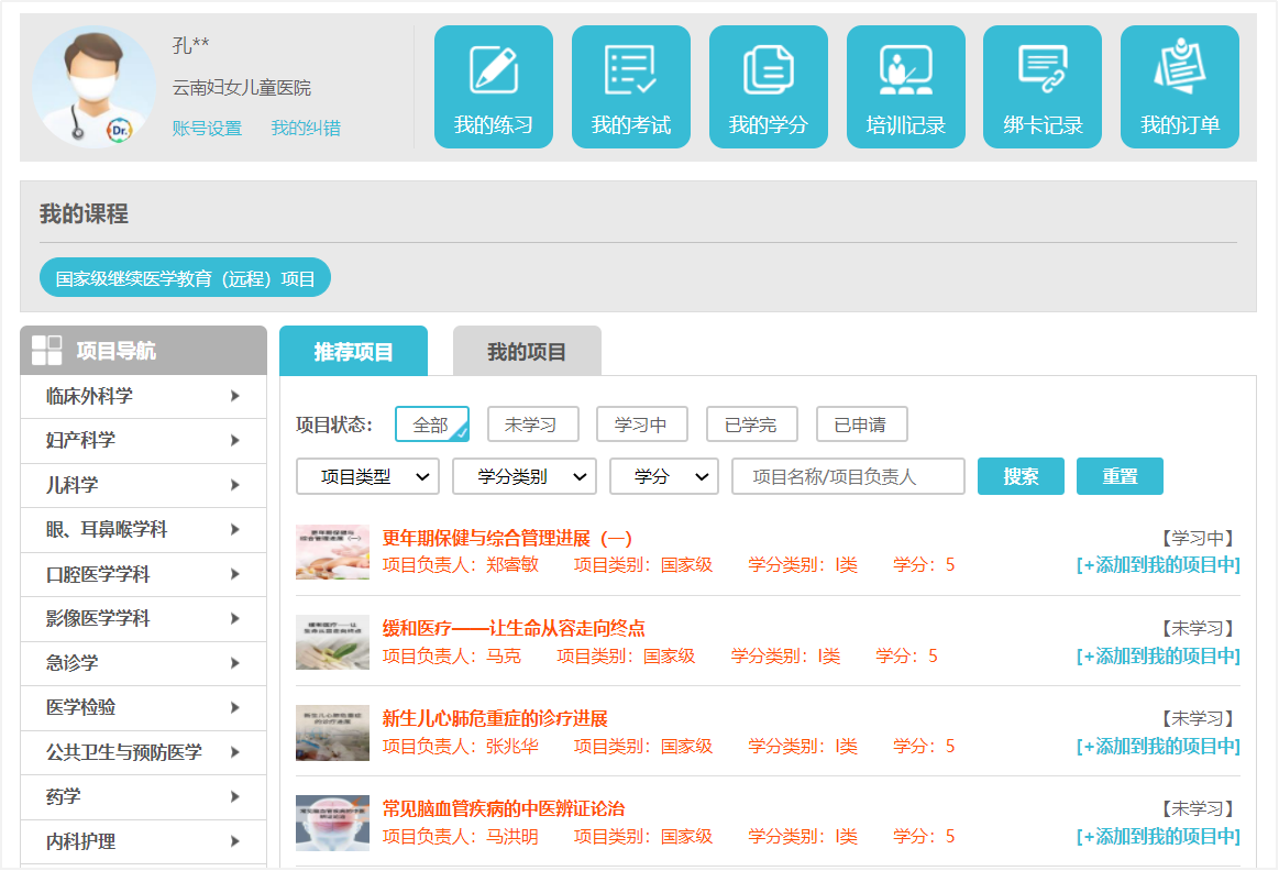 进入“学习中心”→“我的课程”,进入继续医学教育培训班,可通过项目学科导航搜索与您专业相关的项目添加到“我的项目”进行学习。如果您目前未找到想要学习的项目,请不要着急,我们会及时补充各学科项目内容,敬请期待。