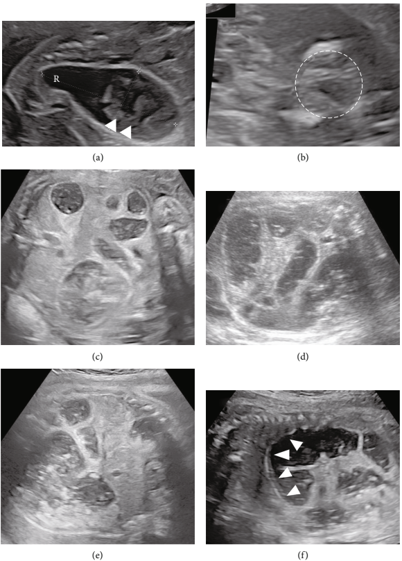 30岁孕妇,在怀孕19周时进行胎儿腹腔囊肿的产前评估。胎儿超声检查显示结肠扩张伴有肠钙化、直肠远端囊及肛门粘膜不可见,提示存在中/高位肛门闭锁伴直肠尿道瘘(图1 a-b)。未发现其他异常及胎儿生长受限。妊娠20周时的胎儿超声检查显示结肠扩张进展,羊水相对减少,但尚未出现羊水过少。即使告知父母胎儿可能预后不良,但父母仍不希望终止妊娠及羊膜穿刺术。从妊娠26周开始,胎儿超声检查显示肠道进一步扩张,导致胸部压迫,妊娠28周后羊水突然减少。尽管膀胱充满液体,但未见输尿管积水及肾积水,这意味着胎儿尿液流出阻塞的存在,而不是尿液产量的减少(图1 c-f)。