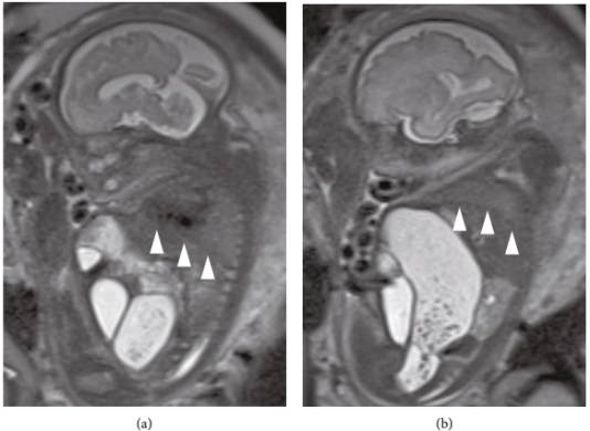 图2. 胎儿MRI。妊娠30周,胎儿T2加权磁共振成像显示小肠扩张、羊水过少和肺发育不全。箭头表示膈膜