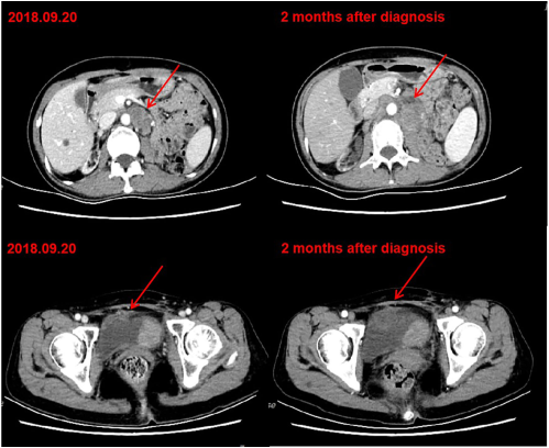 2018年9月,患者膀胱局部复发,盆腔淋巴结和腹膜后淋巴结出现转移。考虑到顺铂的肾毒性和双重化疗的候选性差(ECOG评分2分),患者在第1天和第8天接受1000mg/m2的吉西他滨化疗,每3周一次。经过两个周期的吉西他滨治疗,患者的病情继续进展(图1)。