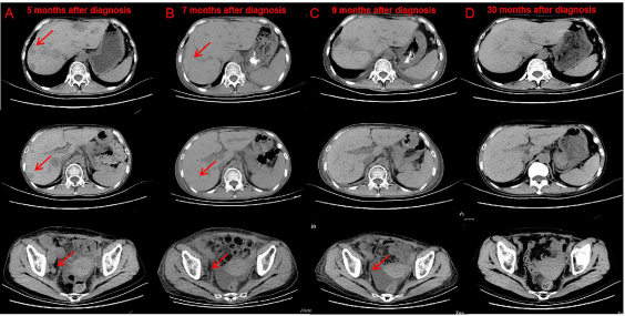 腹膜后淋巴结活检证实转移癌。由于患者的左腿水肿和血尿,给予腹膜后淋巴结和相关膀胱区姑息性放射治疗。对腹膜后淋巴结活检标本进行基因检测,包括448个基因和肿瘤突变负荷(TMB)。共鉴定出97个体细胞突变。其中,只有TP53基因突变对几种细胞毒药物敏感。此外,患者的TMB很高(66.44muts/MB)。2019年2月进行的CT扫描显示接受放疗的腹膜后淋巴结和膀胱肿瘤区域消退,同时盆腔淋巴结进展,出现数个新的肝脏病变。