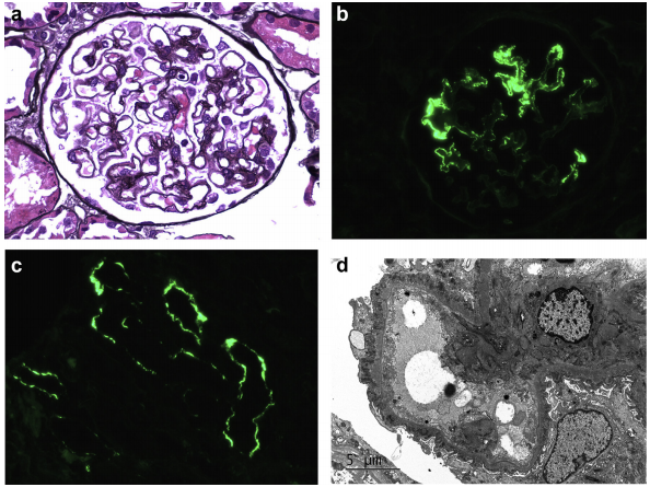 免疫荧光显示IgG(图1b)和κ和λ轻链的3+颗粒节段性至全局性肾小球毛细血管壁染色,伴随着类似分布的2+IgM、1+C3和微量C1。此外,还有局灶性颗粒状TBM沉积物,其IgG、κ和λ染色为1+(图1c)。未观察到系膜、内皮下或动脉血管壁染色。超微结构检查证实存在节段性至全局性上皮下电子致密沉积物,这些沉积物由肾小球基底膜尖峰分隔(图1d),其中一些沉积物发生部分吸收。足细胞表现出70%的足突消失。未发现内皮下或系膜电子致密沉积物、有组织的亚结构或内皮管网状包涵体。