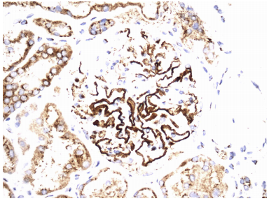 图2. 神经表皮生长因子样1的免疫过氧化物酶染色显示,在上皮下沉积物的分布中,肾小球毛细血管壁呈不完全阳性(原始放大倍数×400),沿肾小管基底膜没有明显的阳性特征