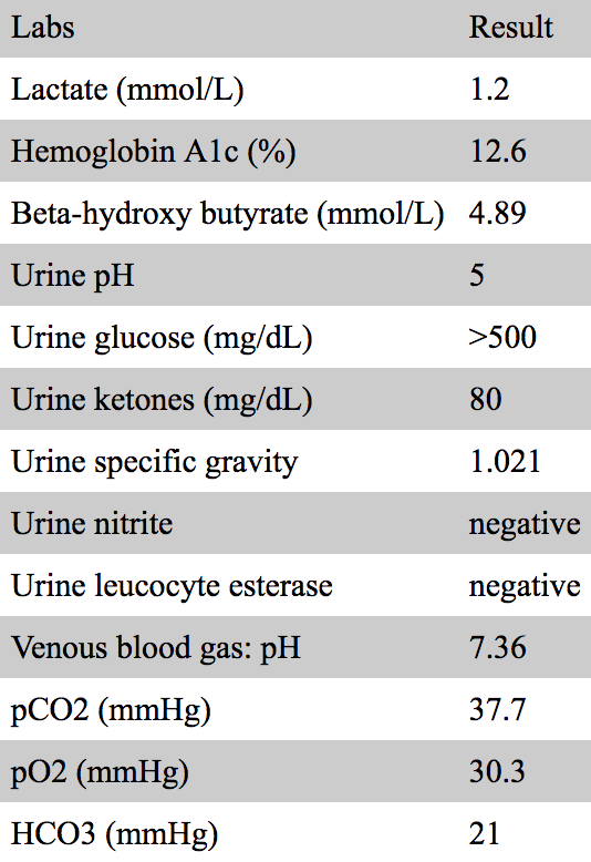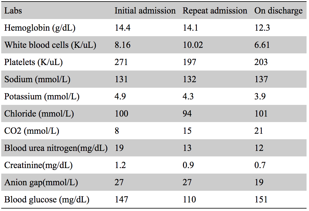 8天后,患者出现食欲下降、全身不适和便秘。体检无明显异常。但是实验室检查(表1)显示血气测量中AG持续升高23,HCO3-持续升高15,β-羟丁酸(BHB)持续升高4.89,pH值持续升高7.36,乳酸持续升高1.2 mmol/L,血红蛋白A1c持续升高12.8%,血糖持续升高110 mg/dl。尿液分析显示葡萄糖>500 mg/dL,酮类为80 mg/dL(表2)。