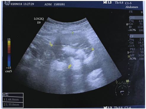 图1. 盆腔肿块大小约为68x55mm,表现为卵巢皮样囊肿,回声不均匀,内部回声高
