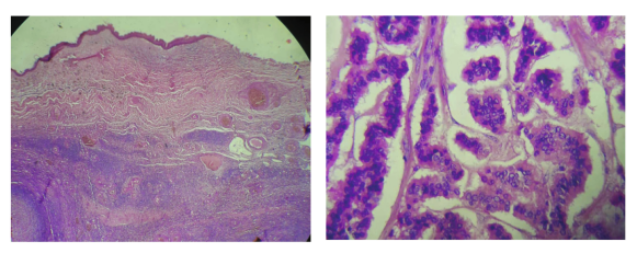 决定进行剖腹手术评估。手术探查发现一个低丰度腹水和一个囊性肿块附着在右卵巢上。冰冻切片诊断为起源于成熟囊性畸胎瘤的鳞状细胞癌,无卵巢包膜浸润及破裂(图2和图3)。随后决定进行全子宫切除术,双侧输卵管卵巢切除术和网膜切除术。患者于第二天出院,术后病程一般。在多学科会议后,决定进行辅助化疗(博莱霉素、足叶乙甙和顺铂(BEP)方案)。