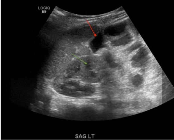 图1. 腹部超声检查显示右肾积水(绿色箭头)和肠袢突出(红色箭头)