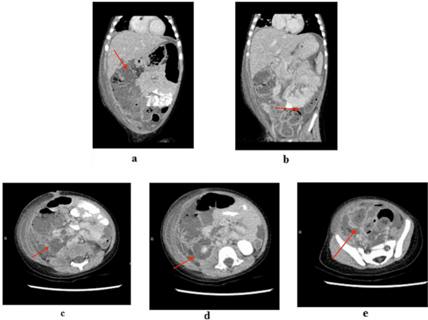 图2. 腹部CT和骨盆造影图像。(a)整个大肠的低密度液体;扩张的升结肠伴有肠积气;(b) 大量腹水,腹膜向腹盆交界处呈片状强化;(c) - (d) 中等容量的右侧肾周积液; (e) 腹盆交界处的椭圆形边缘增强集合