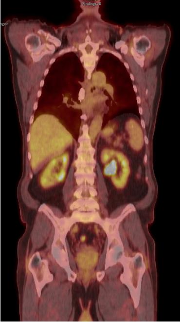 图1. 正电子计算机断层扫描图像。在肾实质中均匀活动,没有其他显著的高代谢活动或淋巴结肿大