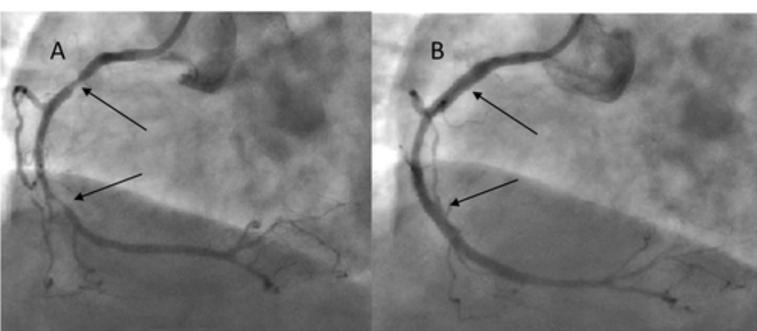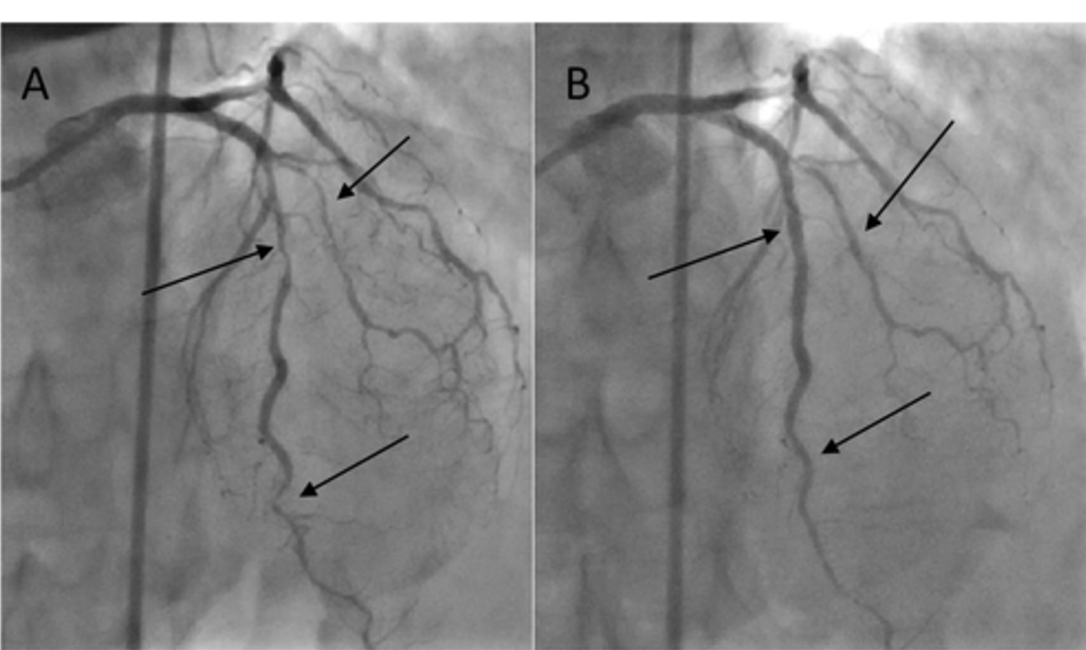 在过去的 4 个月中,患者开始出现轻度至中度体力活动时感到疲倦和呼吸急促。考虑到T2D 持续时间长,需要进行心脏病学评估。体格检查正常,但超声心动图发现左心室 (LV) 射血分数降低(55%)、左心室尺寸正常、左心房扩大和明显的左心室舒张功能障碍 (E/E'=17)。使用布鲁斯协议的超声心动图压力测试因在第三阶段的第一分钟疲劳而终止,心率为115 次/分钟。未出现胸痛,但心电图显示下外侧导联有 0.5-1.0mm ST段压低。在运动高峰期,超声心动图检测到LV心尖运动减退。