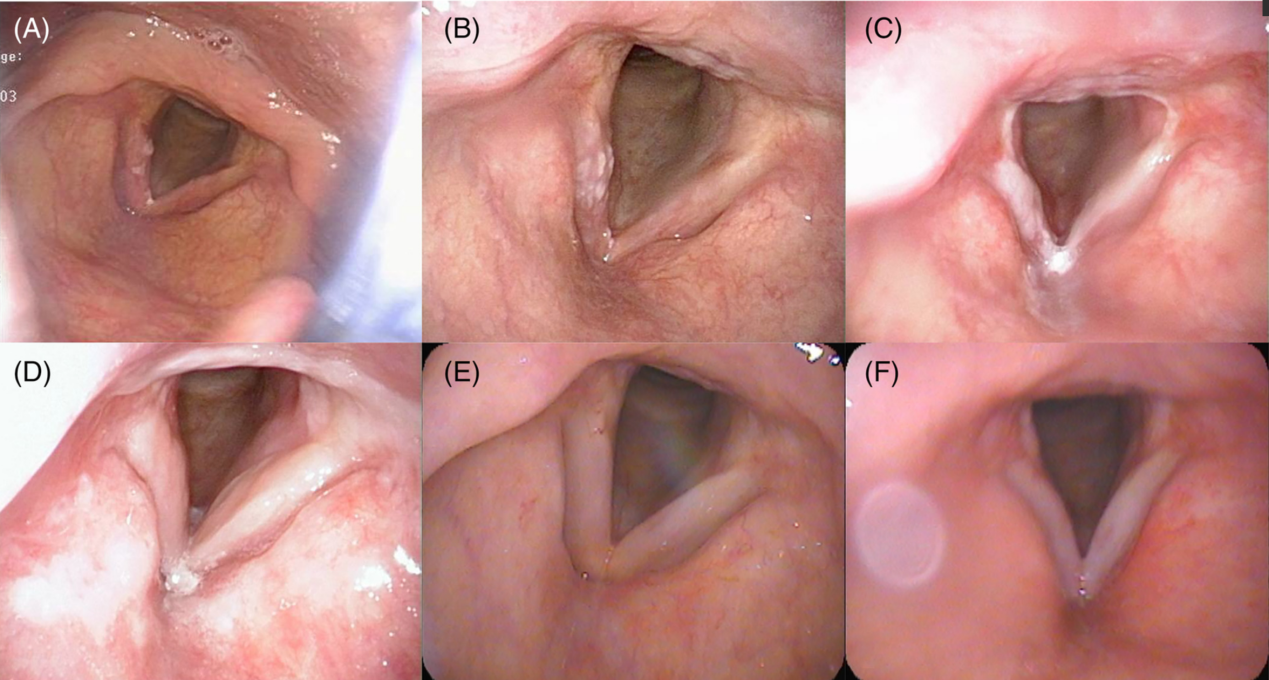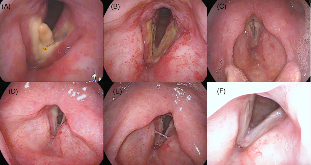 经静脉注射类固醇后喉镜检查结果显示声带运动和坏死略有改善(图3D),随后改用口服泼尼松龙,进一步改善了喉坏死和喉麻痹(图3E)。患者出院2周后(气管造口术后1个月),喉镜检查结果显示双侧声带进一步改善,与气管造口术前状态相似(图3F)。气管孔阻塞后也未观察到呼吸窘迫。