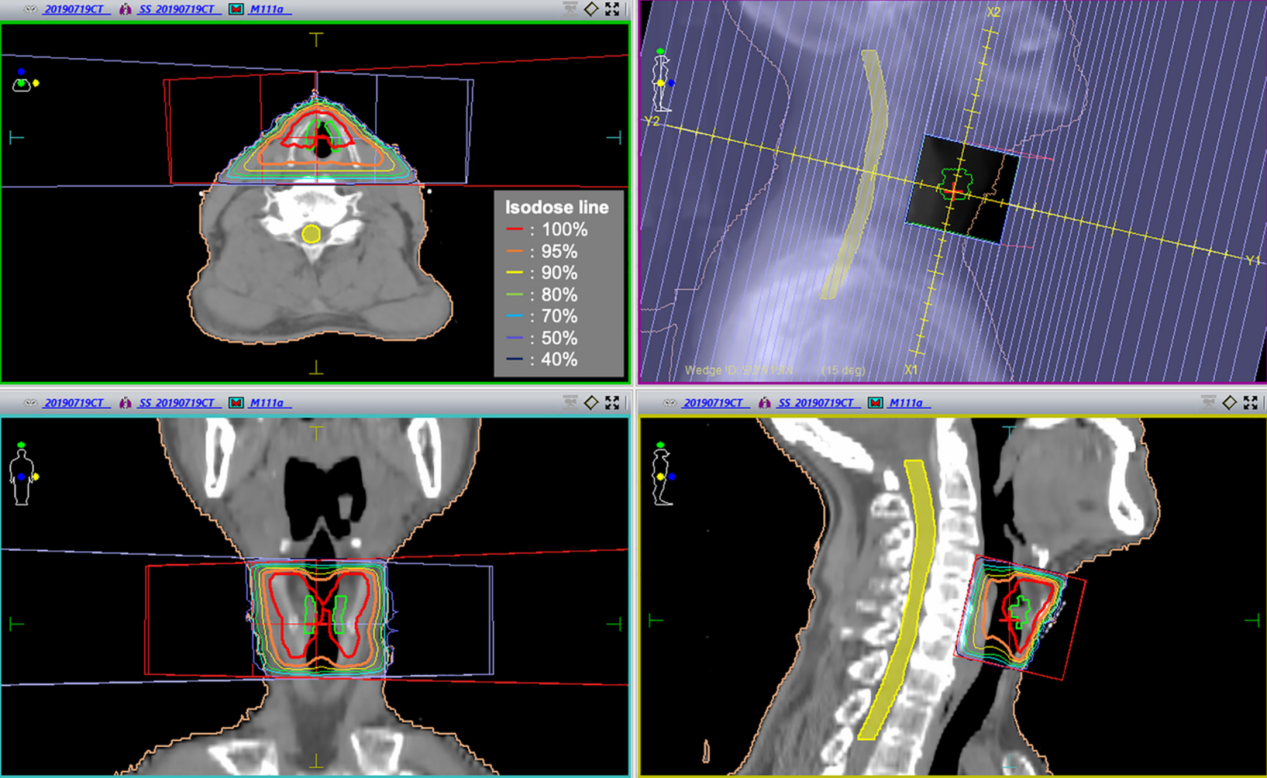 计算机断层扫描(CT)结果显示没有淋巴结或远处转移。患者的临床分期为T1aN0M0,I(TNM分类,第8版)。仅计划了单纯放疗。RT剂量为63 Gy,采用三维常规RT技术和动态楔块,分28个部分输送至喉部。辐射场大小为5.5 × 6 cm,采用传统矩形场(图2)。