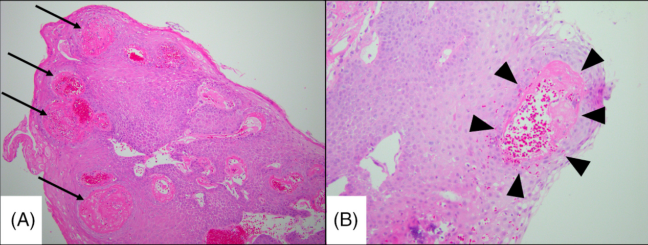 在恢复吸烟2个月后,出现了严重的咽痛和声音嘶哑。喉镜检查发现喉部有一肿物(图3A),当时没有进行CT检查。11天后,手术切除肿物(图3B),组织学诊断为放射性喉坏死,为晚期毒性,无癌症复发(图4)。