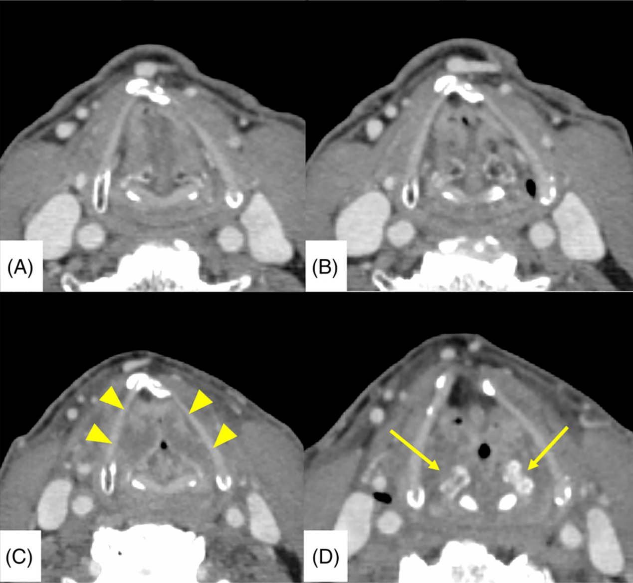 手术切除后,尽管口服止痛药,患者仍持续出现咽痛。术后3周,患者突然出现呼吸困难,喉镜检查结果显示完全性喉麻痹(图3C)。病人接受了紧急气管造口术。气管切开后,持续的咽痛暂时消失。增强CT显示双侧声带水肿,双侧杓状软骨萎缩及硬化(图5)。增强CT检查未发现癌症复发。