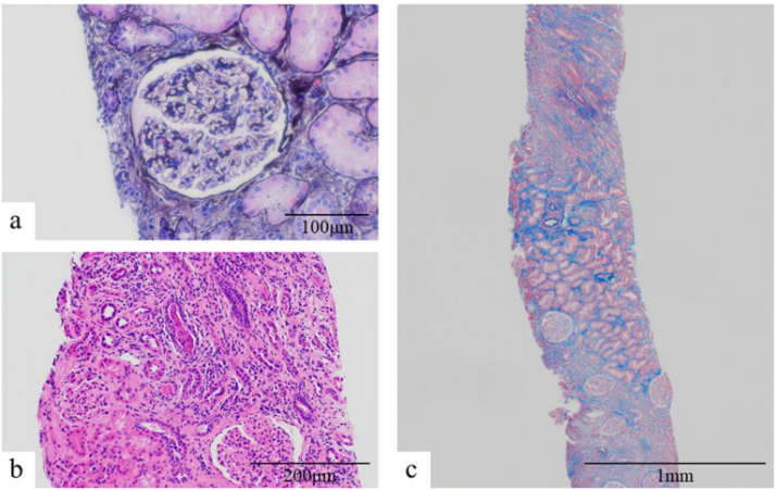 开始静脉注射氨苄西林-舒巴坦钠治疗急性肾盂肾炎。由于尿路感染和缺乏特征性AAV,首次活检后未开始给予皮质类固醇,并对患者进行了随访。在接受抗菌治疗和停止西咪替丁后,患者的肾功能略有改善,但在入院后第31天,s-Cr为1.69mg/dL,MPO-ANCA滴度为121U/mL。