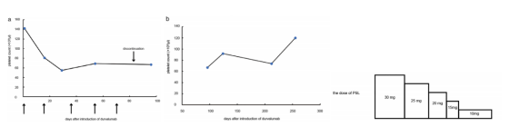 图2. 在使用德瓦鲁单抗和泼尼松龙后血小板计数的变化。(a)从开始使用德瓦鲁单抗到停止使用血小板计数的时间过程。箭头表示德瓦鲁单抗的管理;(b)强的松龙对血小板计数的影响