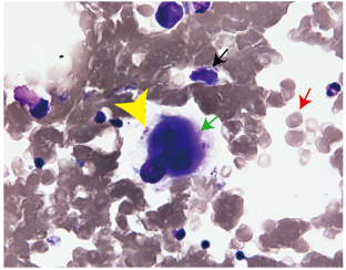 图3. 高倍镜下骨髓标本的发现。骨髓标本包括所有三种类型的造血细胞,如髓系、红系和巨核细胞系。巨核细胞明显减少,周围有少量血小板。黑色、红色和绿色箭头分别表示髓系细胞、红系细胞和巨核细胞。箭头代表血小板
