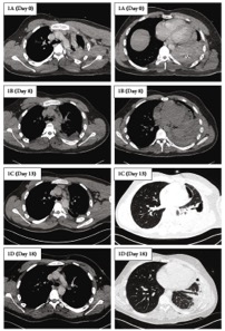 图1. 连续轴位胸部计算机断层扫描(CT)显示左侧血胸随时间缩小。左侧和右侧的图像分别代表在隆凸和肺底水平拍摄的CT图片。第0天为入院日