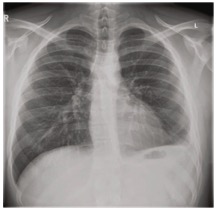 图2. 出院后2周的胸片,肺野清晰,左肋膈角轻度变钝