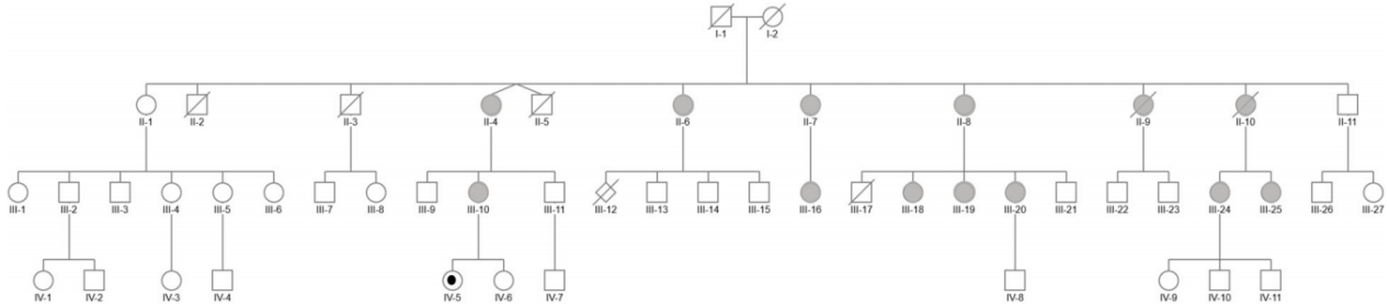 关于第三代,第二代受影响女儿(III-10、III-16、III-18、III-19、III-20、III-24、III-25)所分娩的所有女性均出现慢性痛经,并经止痛药和OCP治疗,无创诊断为子宫内膜异位症(经阴道超声和/或磁共振成像)。值得注意的是,唯一未暴露的女性(II-1)所生的女儿均未出现子宫内膜异位症症状。
