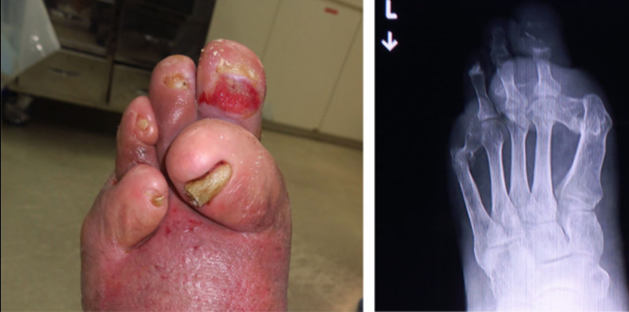 一名73岁的患者的第二趾有一个持续六月的糖尿病足部溃疡,愈合欠佳(图1-左)。患者糖尿病史数十年,自行停止了糖尿病治疗。经检查,患者无发热及体力降低。患者第二跖骨头区域有局部感染,左脚溃疡暴露了第二个近端指间关节(PIPJ)。溃疡周围的皮肤红肿,指向溃疡处第二跖骨指骨关节(MTPJ)的足底表面。踝臂指数为1.18/1.26(右/左),皮肤灌注压为97/75 mmHg(背侧/足底)。通过一个简单的负重X线图像观察左脚,第二近端指骨和中指骨有破坏(图1-右)。第一和第五指的MTPJ脱位(图1-右侧)。伤口、缺血和足部感染(WIfI)分类为W2、I1、fI 2、F 0。