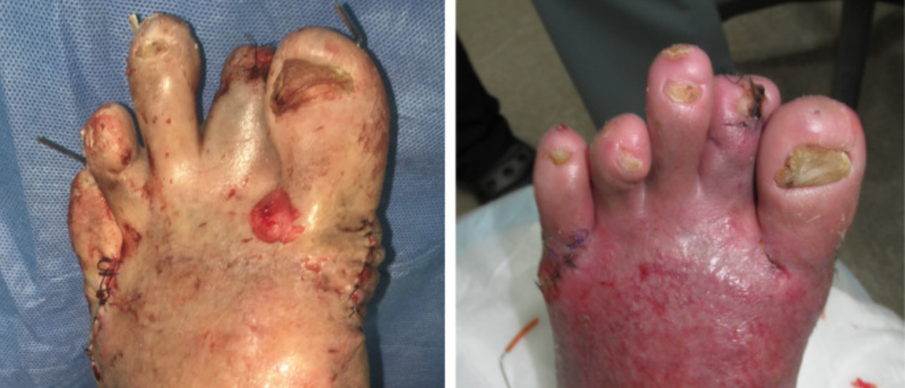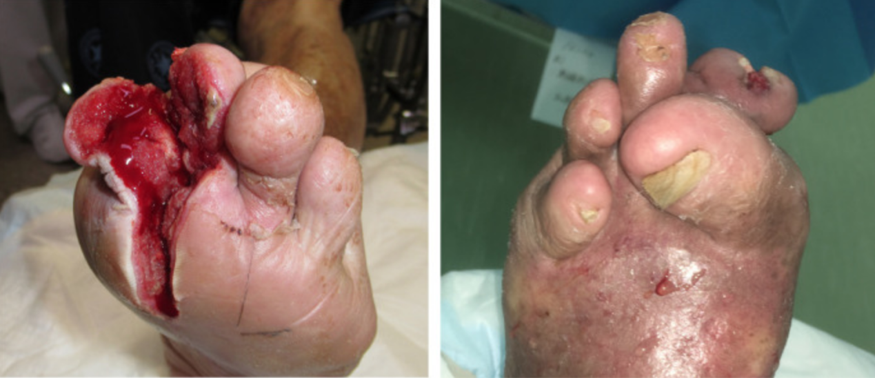在门诊立即从PIPJ到第二条射线的MTPJ进行皮肤切开(图2-左)。皮肤切开后两天,红肿减轻。在局部感染部位和足部溃疡清创时观察到溃疡的逐渐改善。清创后伤口治疗持续两周,直到溃疡得到改善并被健康的肉芽组织取代(图2-右图)。然而患者左脚第一和第五指的MTPJ仍然脱臼。第一趾压迫在第二趾上,第五趾压迫在第四趾上。因此,第二趾残端手术与跖骨头手术切除同时进行。手术切除第一和第五跖骨头(图3-左)。手术切除后两周,手术伤口愈合,患者出院(图3-右图)。