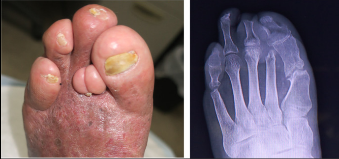 在随访中,两年内患者仍在使用定制的足部矫形器。他可以独立行走,并且足部溃疡没有复发(图4-左)。修正后的第一和第五趾有点变形。第二趾缩短,没有趾骨,第一个趾进入该空间(图4-右图)。第五趾有轻度内翻畸形。前掌形状是圆形的,似乎是因为他的鞋子。由于跖骨头切除后没有关节,软组织畸形导致了现在的足部形态。事实上,第一和第五趾的运动是灵活的。