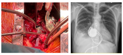 由于左心室腔较小,采用改良技术植入LVAD,通过左心房提供支持。通过右心房切开术,植入一根由20 mm Gore-Tex®插入式移植物制成的导管,一端缝入已形成的房间隔缺损,另一端用LVAD的缝合环缝入右前房壁。然后将HeartWare™HVAD™流入套管插入右心房壁的Gore-Tex®移植物中,并固定在缝合环上(图1)。修剪流出的移植物并与升主动脉吻合。三尖瓣后叶在相邻连合处缝合。左心耳未闭合。手术结束时,HVAD固定在胸腔右侧,然后胸腔闭合(图2和图3)。术后,患者在重症监护病房(ICU)接受护理,并于术后第二天(POD)拔管。患者于POD7转出ICU和高度依赖病房,于POD 21出院。
