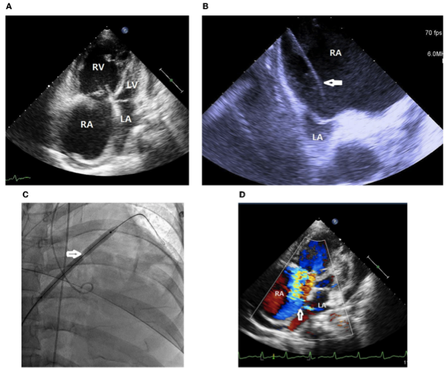图1. (A)经胸超声心动图显示右心房和右心室明显扩张,左心房和左心室小而压缩。(B)心内超声心动图显示右心房明显扩张,左心房小而受压。经中隔Brockenbrough针和Mullins鞘(白色箭头)用帐篷征探测房间隔。(C)用6 mm×8 cm的球囊(白色箭头)扩张房间隔。(D)经胸超声心动图证实建立了从右向左的心房间分流(白色箭头)。RA,右心房;RV,右心室;LA,左心房;LV,左心室