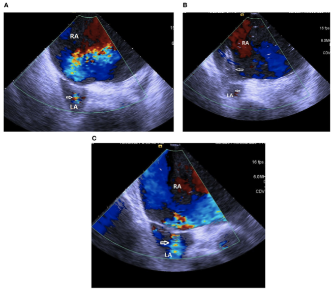 图2. (A)ICE证实了先前球囊房间隔造口术造成的房间隔分流(白色箭头)。(B)ICE显示在第二次球囊房间隔造口术中一个8 mm的球囊(白色箭头)膨胀。(C)第二次球囊房间隔造口术后ICE显示从右向左分流增加(白色箭头)