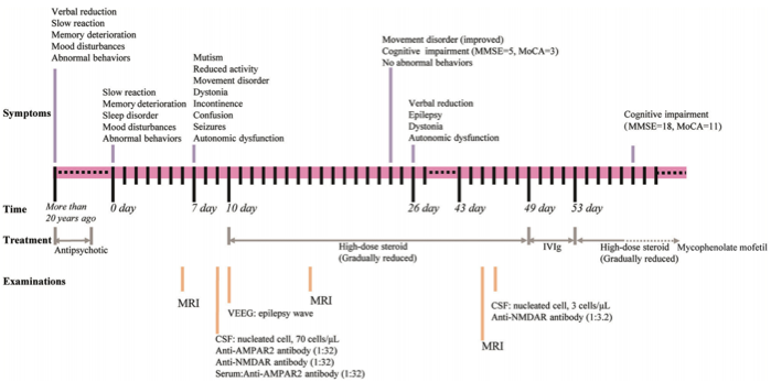 图1. 案例过程的时间表。上部显示症状,中部显示时间和治疗,下部显示进行的检查