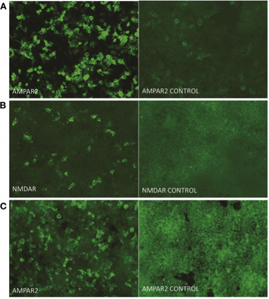 图2. 血清和脑脊液中存在自身免疫抗体。发病后9天,脑脊液中抗AMPA受体2抗体(A)、抗NMDA受体抗体(B)和血清中抗AMPA受体2抗体(C)的免疫活性。脑脊液和血清中的抗体滴度测量为1:32(原始放大倍数,200×)