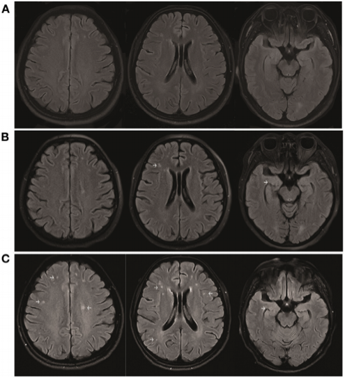 图3. 与发病后6天(A)相比,发病后17天(B)和45天(C)的脑MRI显示皮质下白质和内侧颞叶的分散液体衰减反转恢复高强度增加